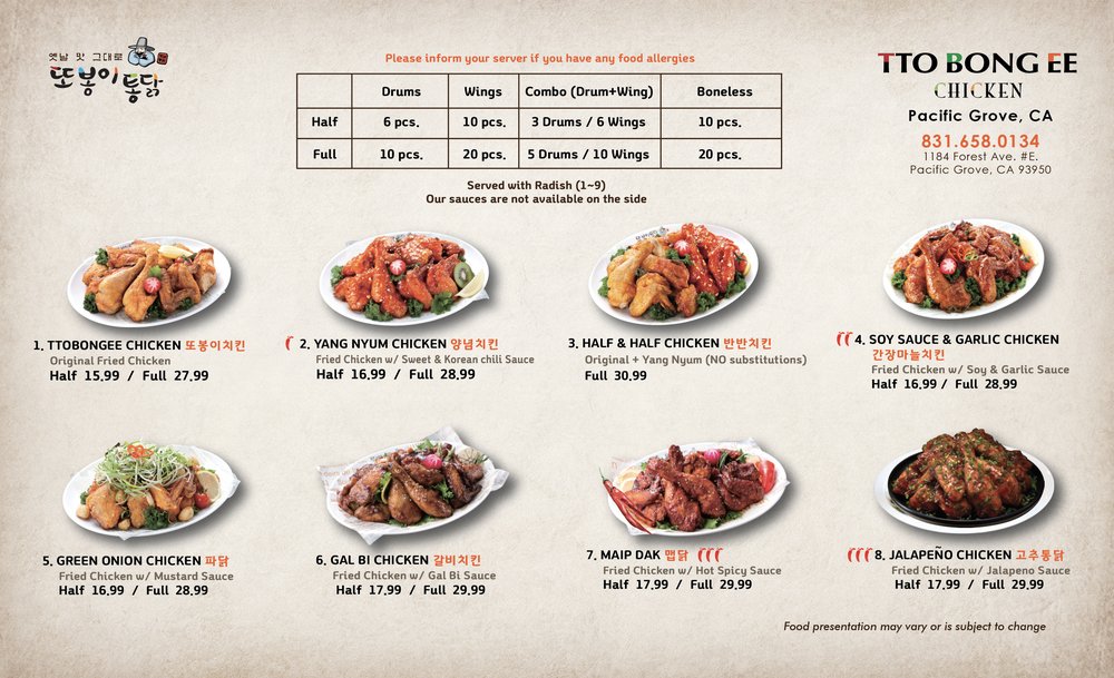 Welcome to Ttobongee, your go-to destination for authentic Korean chicken wings in Pacific Grove, CA. With a focus on quality and flavor, Ttobongee offers a tantalizing menu featuring dishes like Original Fried Chicken and Yang Nyum Chicken, expertly crafted to deliver an explosion of flavors with each bite. The wings are renowned for their crispy exterior and juicy interior, perfectly coated in a variety of sauces ranging from spicy to sweet.
